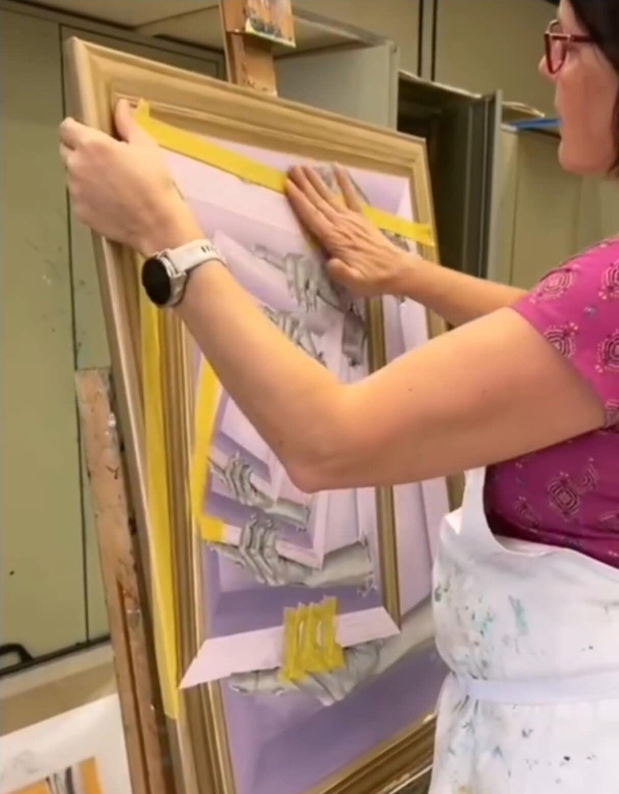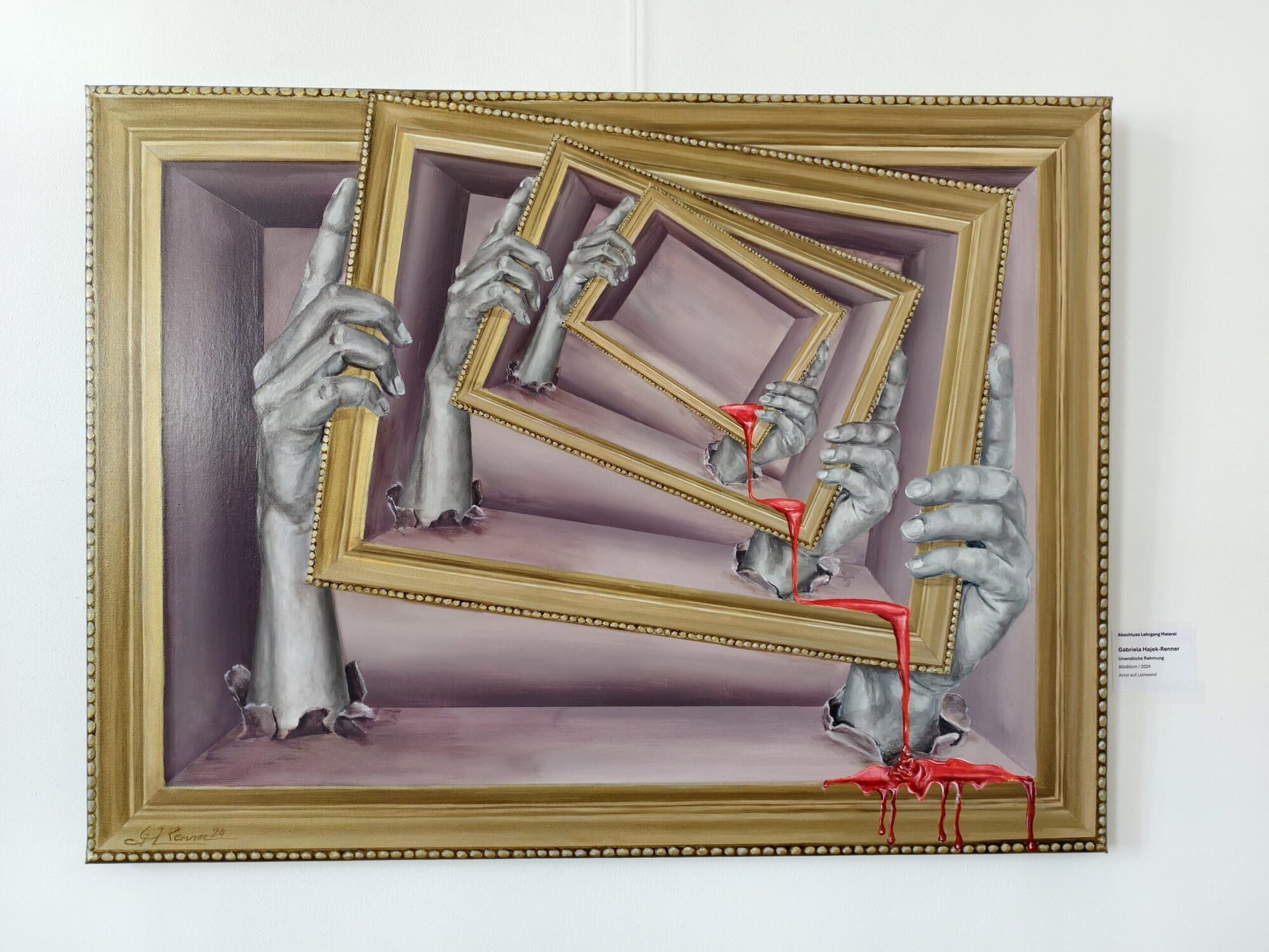 Das Kunstwerk „Unendliche Rahmung“ aus der Serie Zwischen Rahmen und Realität spielt mit Wahrnehmung, Tiefe und der Illusion des Unendlichen. Aus aufgerissenen Öffnungen greifen realistisch gemalte Hände nach goldenen Bilderrahmen, die sich endlis ineinander verschachteln.